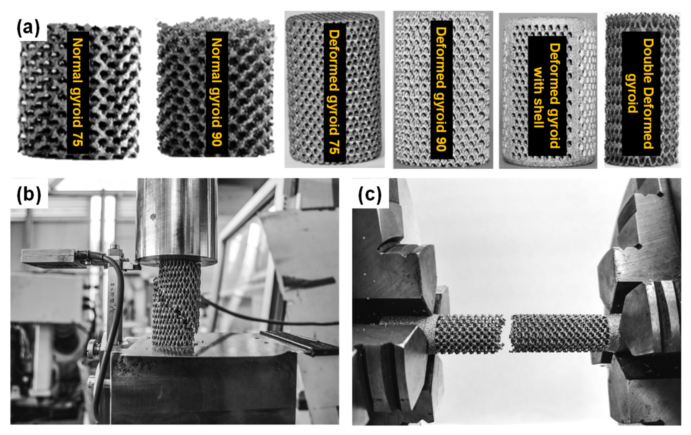 - Yánez, A.; Cuadrado, A.; Martel, O.; Afonso, H.; Monopoli, D. Gyroid Porous Titanium Structures: A Versatile Solution to Be Used as Scaffolds in Bone Defect Reconstruction. Mater. Des. 2018, 140, 21–29. [Google Scholar] [CrossRef]