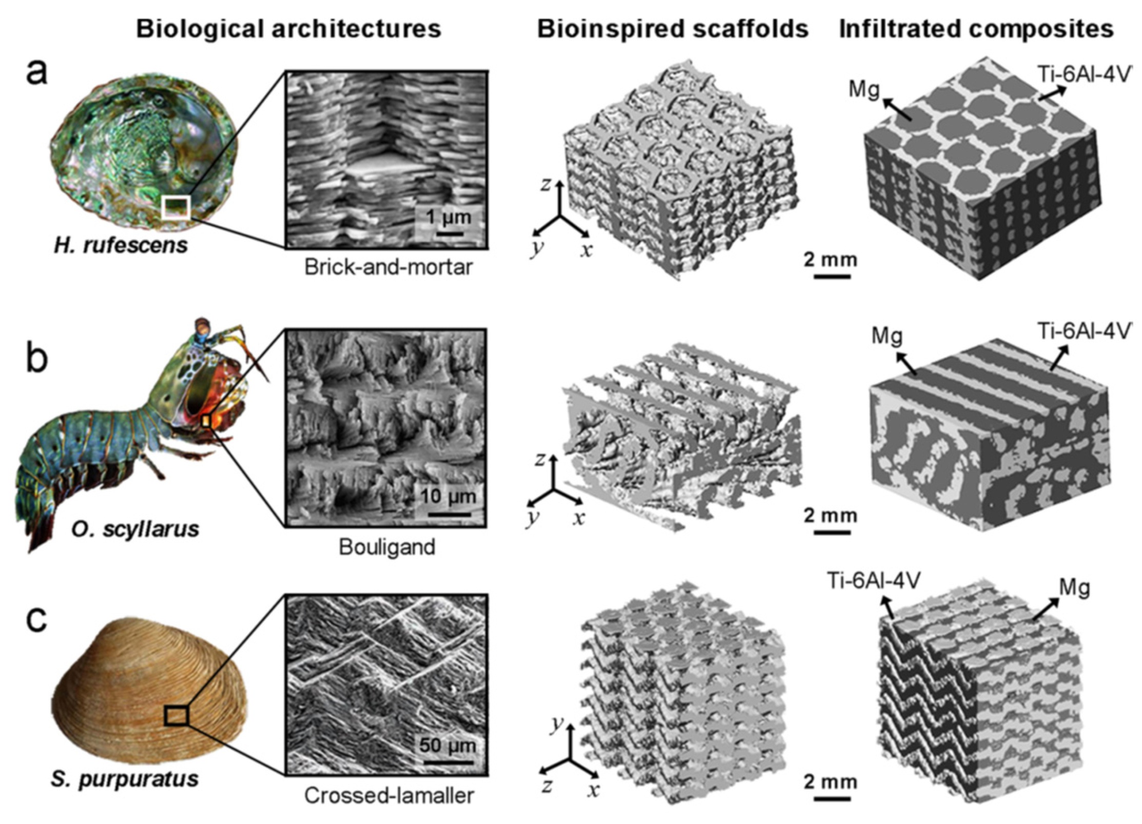 - Zhang, M.; Zhao, N.; Yu, Q.; Liu, Z.; Qu, R.; Zhang, J.; Li, S.; Ren, D.; Berto, F.; Zhang, Z.; et al. On the Damage Tolerance of 3-D Printed Mg-Ti Interpenetrating-Phase Composites with Bioinspired Architectures. Nat. Commun. 2022, 13, 3247. [Google Scholar] [CrossRef]