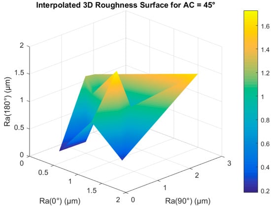 The strongest and most statistically significant correlation was found between cutting angle and surface roughness, with r = 0.486 and p = 0.004 (Figure 5). In this figure, the blue dots represent the individual experimental measurements of maximum surface roughness obtained at each cutting angle, illustrating the spread and variability in the dataset. The red line represents the linear regression trend line, which highlights the overall increasing tendency of surface roughness as the cutting angle becomes more misaligned with the filament raster direction. This relationship indicates that the toolpath orientation relative to the filament raster direction plays a dominant role in controlling chip segmentation and plowing dynamics during micromilling. Cutting parallel or near parallel to the primary raster direction minimizes force fluctuations and surface tearing, resulting in smoother surface finishes.