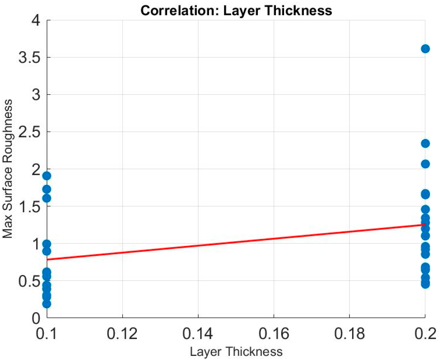 - Layer thickness exhibited a moderate positive correlation with surface roughness (r = 0.326, p = 0.060), indicating that thicker layers tend to produce rougher post-machined surfaces due to increased staircase effects and nonuniform interlayer bonding. Finer layers enhance chip stability and microstructural uniformity during finishing, consistent with observations by Boschetto et al. [1] and Caminero et al. [2].
