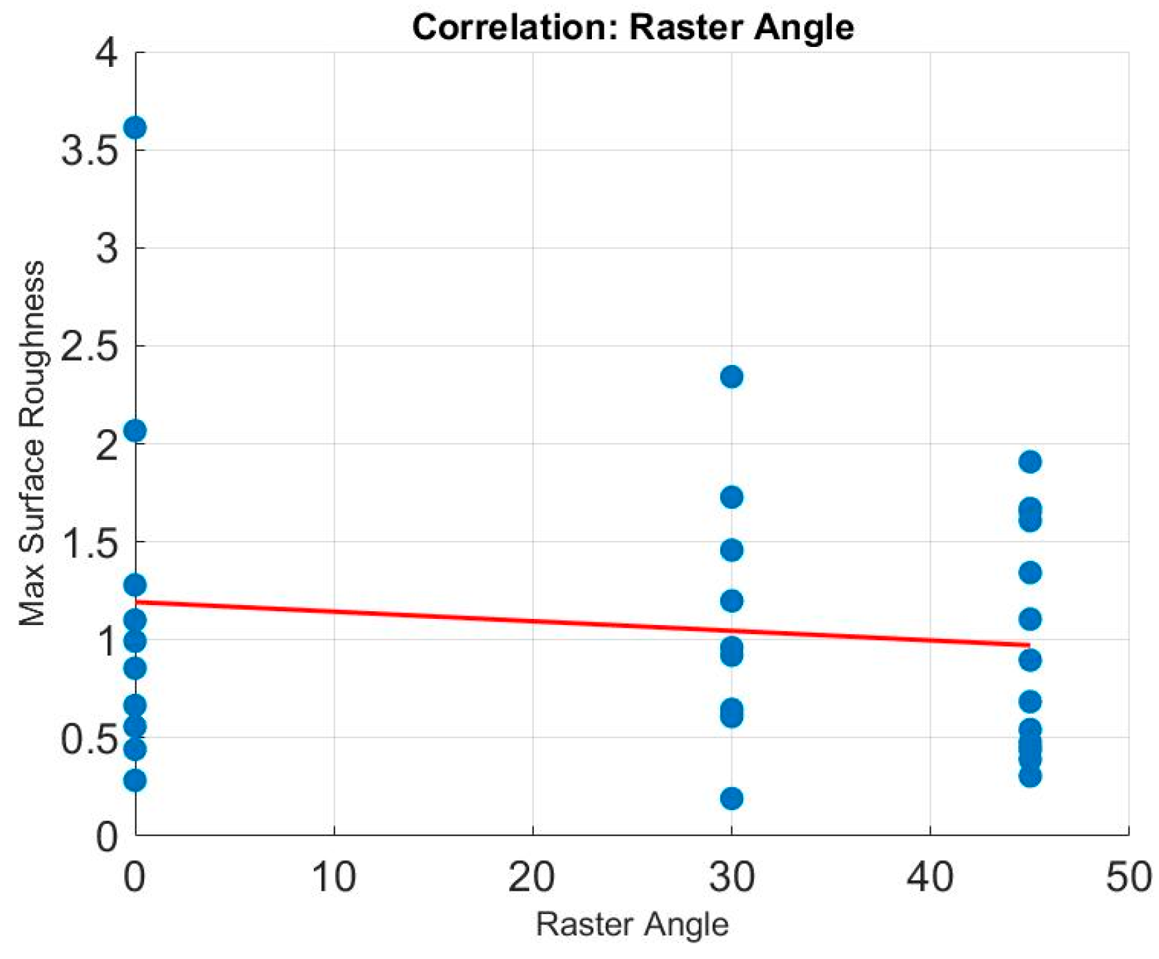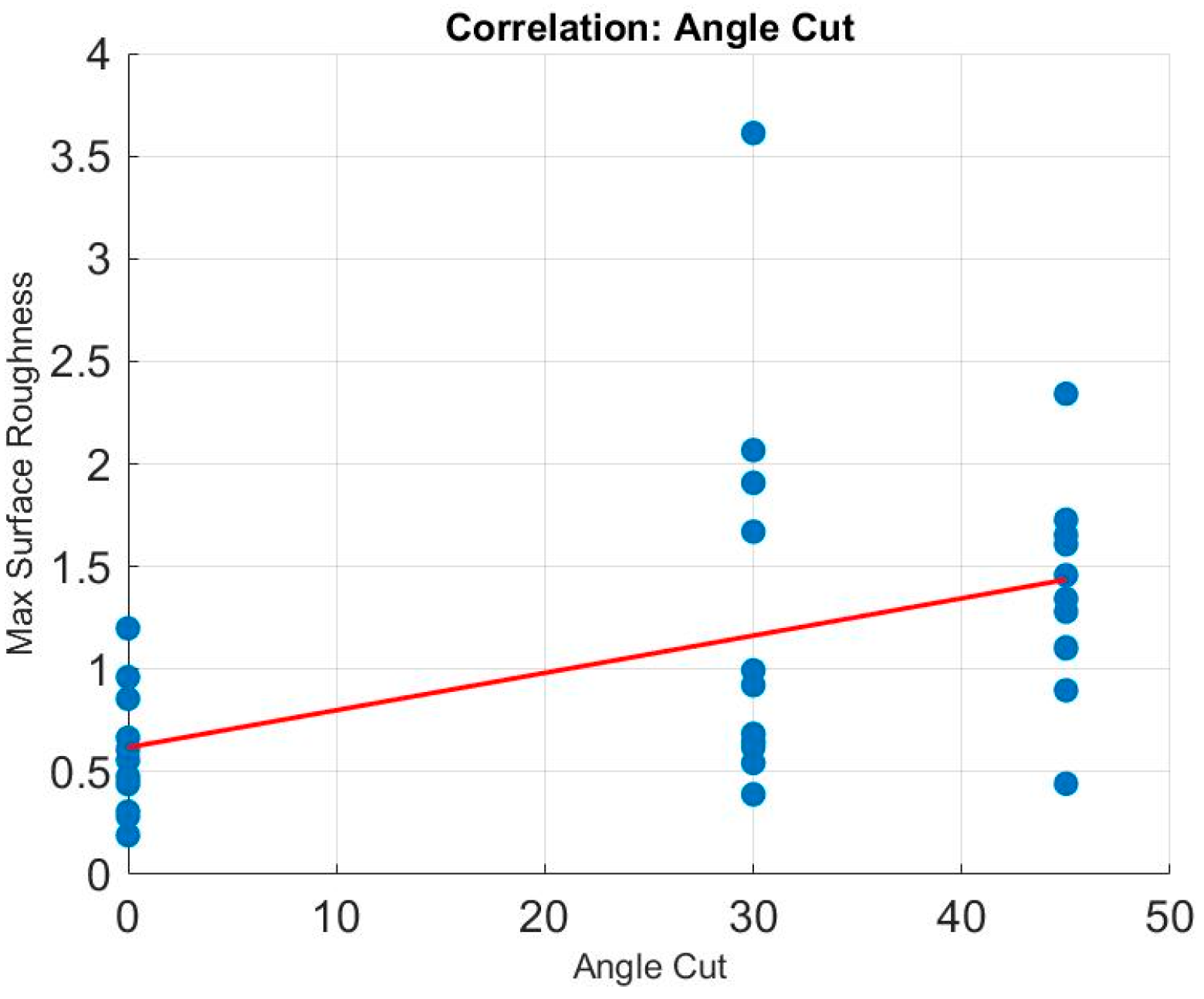 - Cutting direction (angle cut) was identified as the dominant factor, showing a strong correlation with roughness (r = 0.486, p = 0.004). Machining parallel to the filament deposition path yielded the smoothest surfaces, validating the anisotropic cutting behavior observed in micromilling studies of AM metals [17,19].