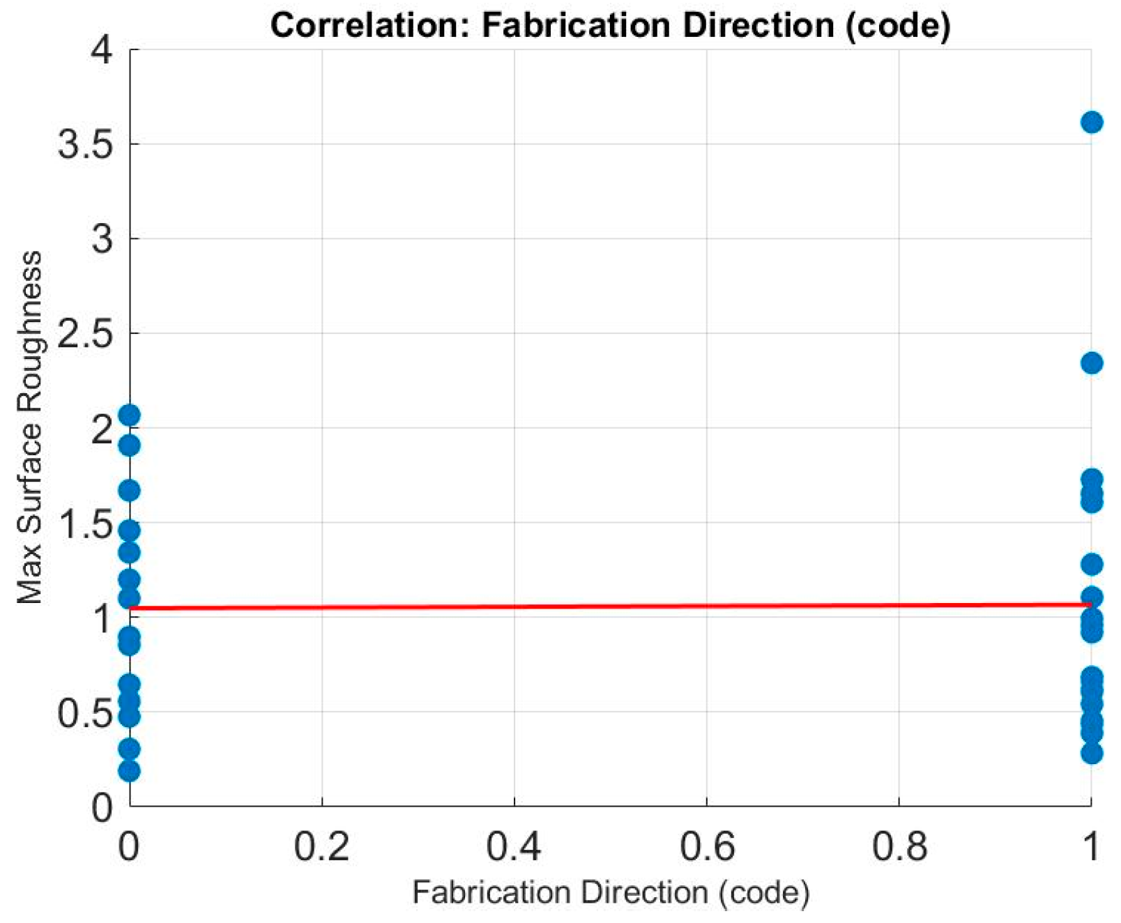 - Fabrication direction and raster angle demonstrated a weak statistical influence on surface roughness (r = 0.013, p = 0.942 and r = –0.130, p = 0.466, respectively). Their limited contribution suggests that sintering effectively homogenizes internal porosity, making machining orientation the dominant factor governing surface response. Similar behavior was reported by O’Connor et al. [9] and Kurose et al. [21].