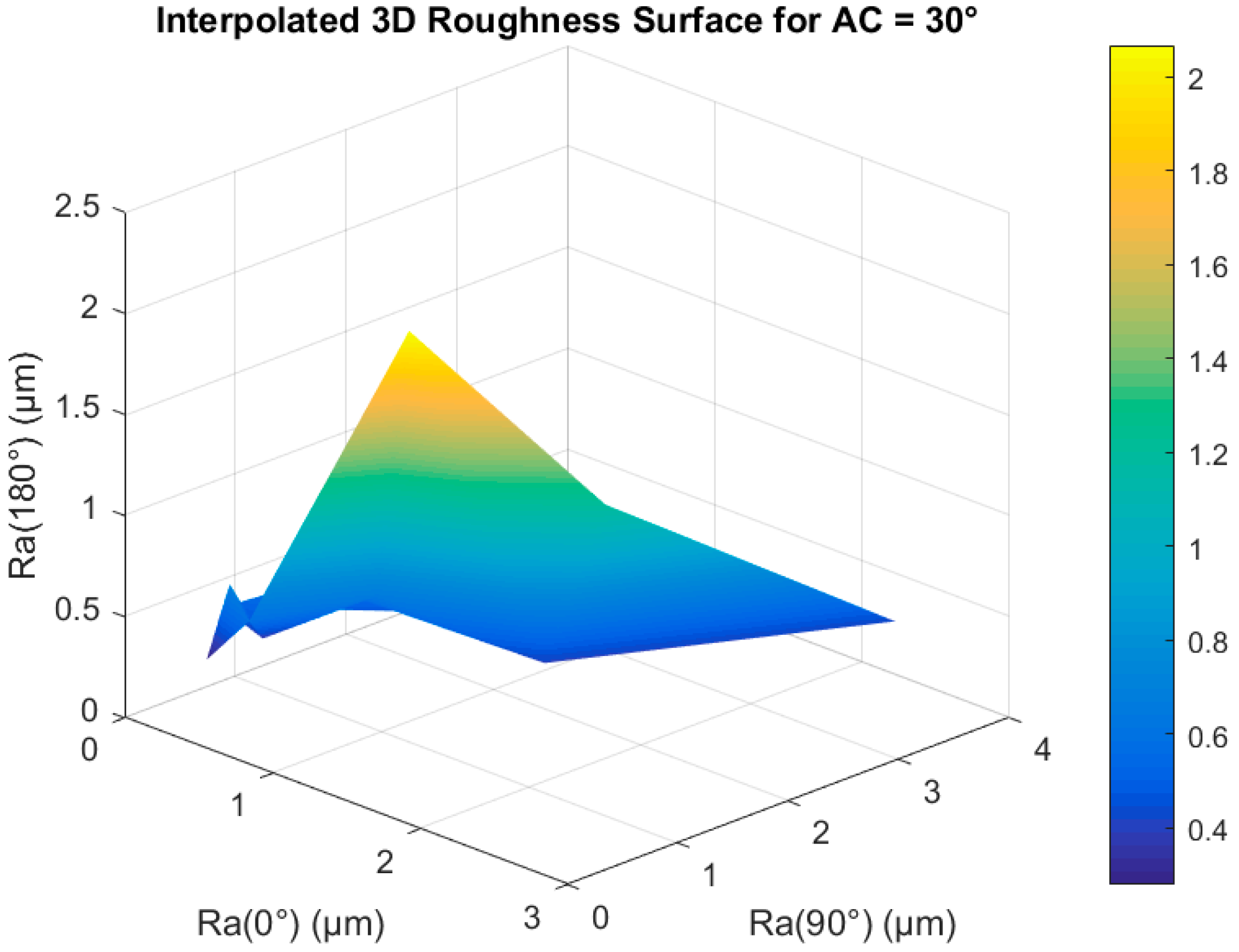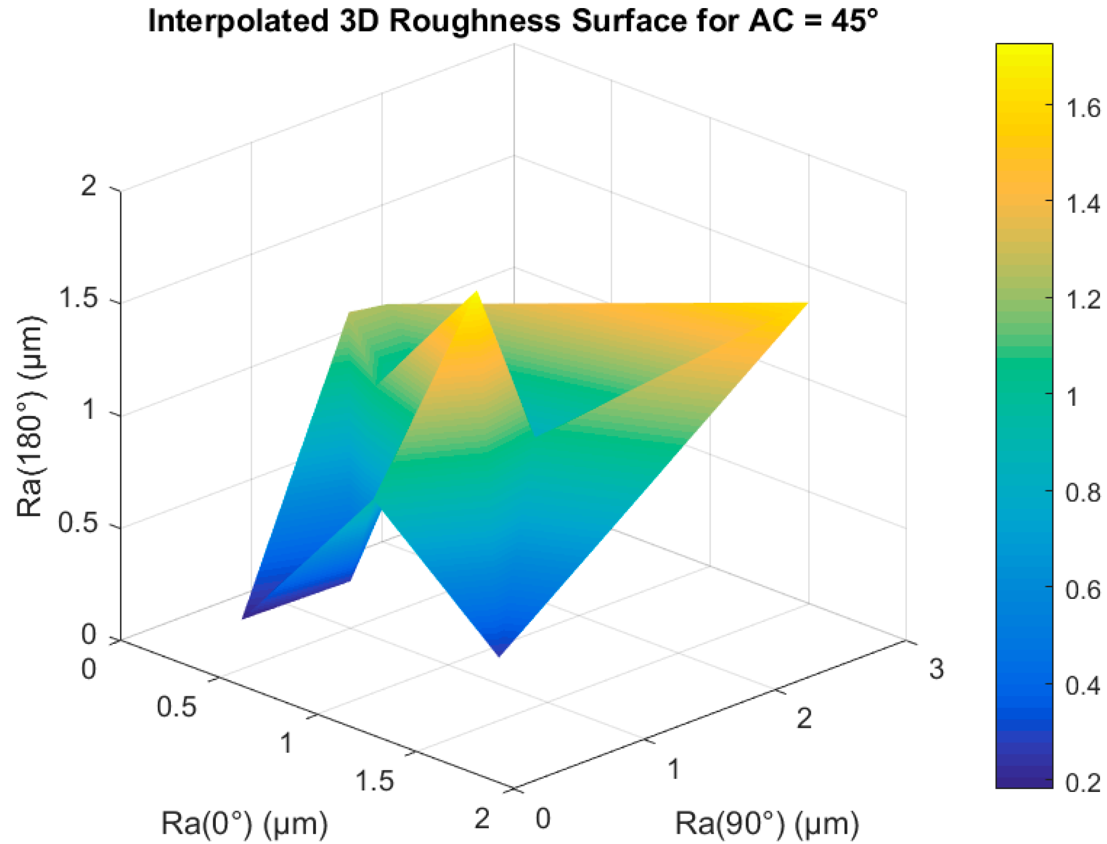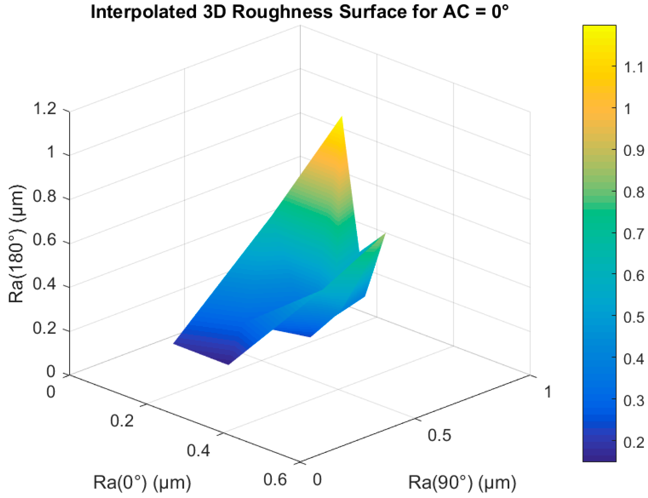 | Experiment # | Input 1: LT (mm) | Input 2: RA (°) | Input 3: FD | Input 4: AC (°) | Ra (0°) (µm) | Ra (90°) (µm) | Ra (180°) (µm) | Max Overall Ra (µm) |
