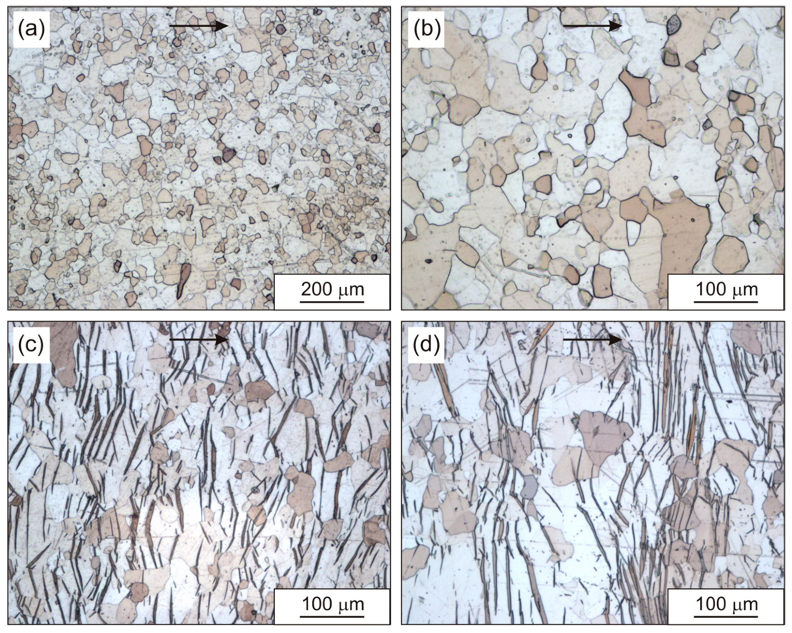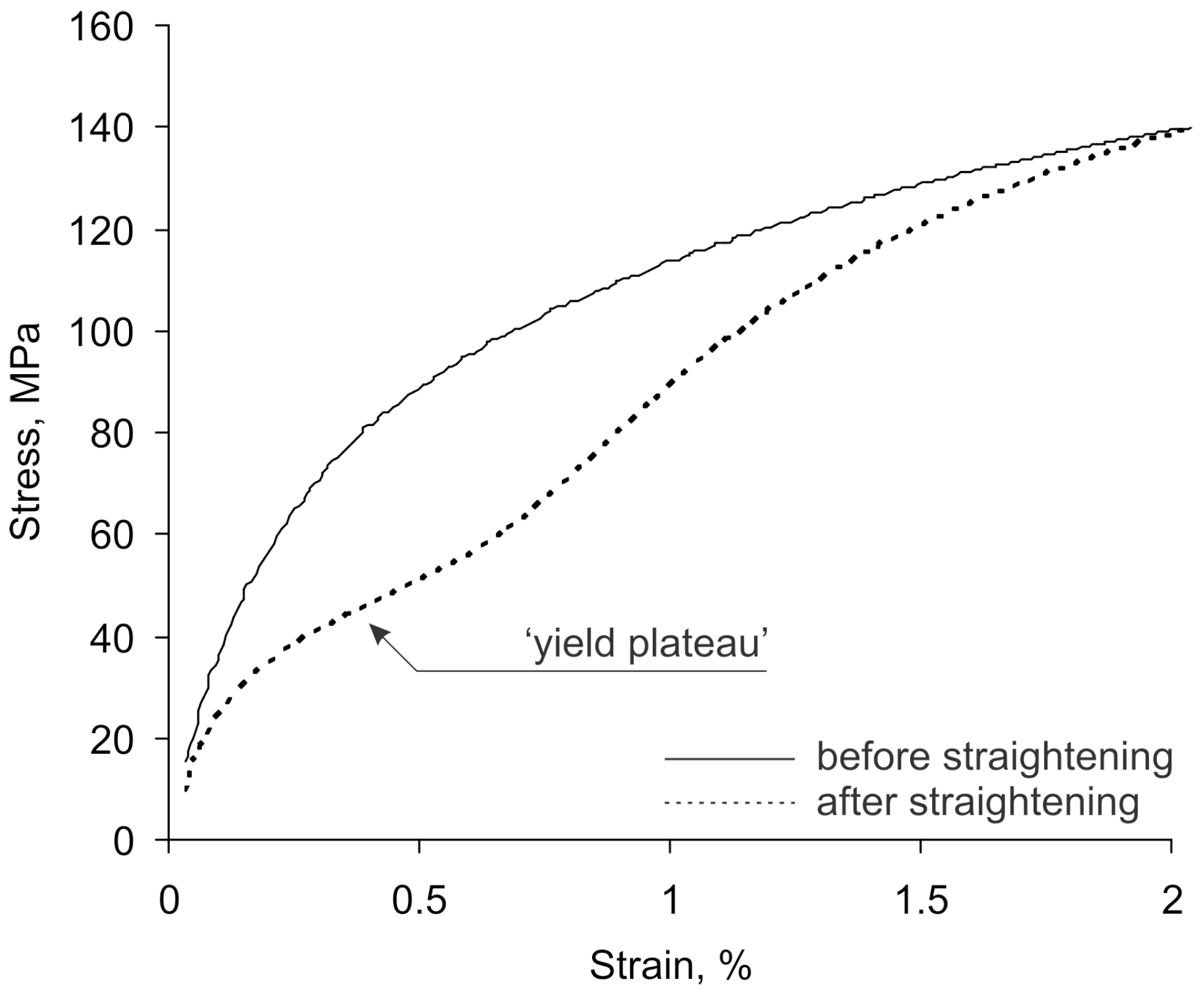 - Roller straightening results in the appearance of an inflection point (‘yield plateau’) in the tensile stress–strain curve of longitudinal specimens, as well as a nearly twofold decrease in the yield stress from 85 to 45 MPa. This effect was observed only on longitudinal specimens, and it persists when increasing the number of passes through the roller straightening machine from one to three. The use of miniature tensile specimens, compared to full-scale ones, weakened or suppressed this effect.