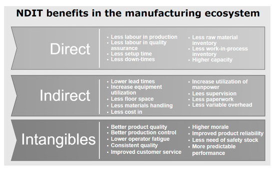 Psarommantis et al. (2020) presented a review highlighting the key factors and advantages of adopting new quality improvement strategies to address manufacturing defects, focusing on specific metrics and examples from various industrial scenarios [4]. Implementing NDI solutions may improve station idle time availability by improving the following indicators: rejected parts (production lost due to inferior quality) and setup times (production lost due to setup times). The capability of defect detection, identification, and quantification introduced by NDI systems provides advantages: increasing machine utilisation and improving parts’ output rates per machine, thus lowering the number of pieces of equipment required to manufacture a part. From a literature review, the main direct, indirect, and intangible benefits that the NDI solution can add to the manufacturing ecosystem were extracted and are represented in Figure 1.