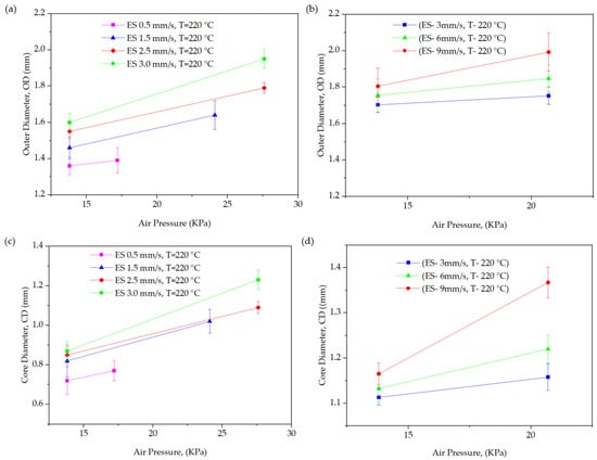 Effect of extrusion speed over OD/ID/ST: (a) at 205° C with PLA, and (b) at 220° C with PLA; effect of extrusion speed over OD/CD/ST: (c) at 220 °C with SEBS, and (d) at 230 °C with SEBS.