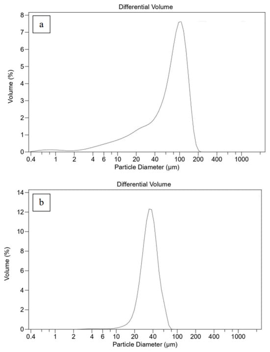 Powder particle distributions: (a) ECTFE and (b) Al2O3.