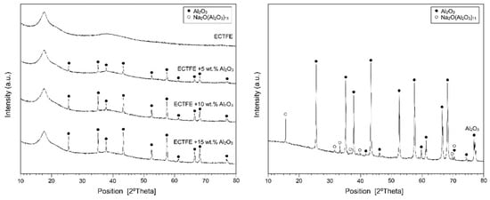 Figure 3 shows the XRD patterns of ECTFE powder and its various blends with Al2O3 on the left and the pattern of Al2O3 as a reference on the right. For pure ECTFE, a broad peak can be observed at low angles (~17° 2Ɵ), characteristic of the nature of the polymer. The XRD pattern for pure Al2O3 shows sharp and intense peaks, characteristic of the crystalline nature of alumina, and additional weaker peaks identified as Na2O·(Al2O3)11, which can result from the manufacturing process of this powder. As alumina is added to the blends, distinct narrow peaks corresponding to Al2O3 begin to appear in the patterns. As expected, the intensity of the alumina peaks increases proportionally with the concentration of Al2O3 (5%, 10%, and 15 wt.%) in the blend.