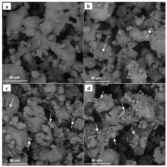 Morphologies of the different coatings: (a) ECTFE; (b) ECTFE + 5 wt.% Al2O3; (c) ECTFE + 10 wt.% Al2O3; and (d) ECTFE + 15 wt.% Al2O3. (Arrows indicate the ceramic particles embedded in the polymeric matrix for all the coatings containing Al2O3).