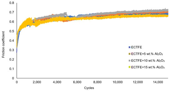 Ball-on-disc tests were conducted to determine the friction coefficients of the coatings. Figure 5 shows the curves depicting the variation in the friction coefficient over the sliding cycles, and Table 5 presents the friction coefficient values for the coatings. Most of the coatings achieved a similar friction coefficient, near 0.70, but the 15 wt.% Al2O3 coatings exhibited the lowest friction coefficient at 0.66. A lower ceramic content in the coating resulted in a slight increase in the coefficient of friction, as the ceramic particles interfered with the sliding process. In contrast, a higher concentration of ceramic particles enhanced the sliding performance by significantly improving the friction resistance and reducing the coefficient of friction. In this case, ceramic particles may enhance lubrication.