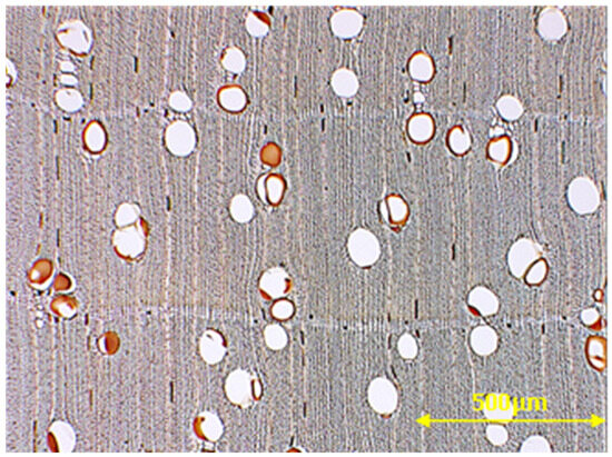 Figure 2). It exhibits a semi-ring porous grain structure, with parenchyma cells forming bands and vasicentric patterns around vessels. The grain tends to be straight with occasional waviness, which can influence the smoothness of laser-cut surfaces. A ray’s cells are both horizontal and vertical. They range in size from uniseriate to multiseriate. The relationship between the length and diameter of vessel members is definitely negative. Susceptibility and mesomorphic values of two virtually identically aged and mature trees growing in the same place are substantially different. There are spiral thickenings on the interior surface of the vessel member’s wall. The axial and ray parenchyma cells, as well as the arteries and fibers of the heartwood, can utilize extractives. At the perimeter of the heartwood, parenchyma cells undergo necrobiosis. Death and senescence of parenchyma cells were associated with the reduction in starch grains and the buildup of extractives. There is a climacteric rise in succinate dehydrogenase and acid phosphatase activity along the sapwood–heartwood interface, which may be connected to heartwood production. Increased peroxidase activity in the vicinity of the cambium indicates that it may contribute to lignification [