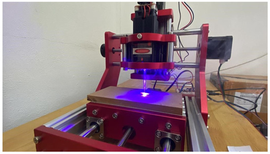 Figure 4, was used to conduct the experiment. This laser equipment is controlled by GBRL software (CNC3018PRO). The frame of the laser machine is made of aluminum, and the metal chassis is robust due to a red oxidation process. The laser machine’s operating system is compatible with Windows XP, Windows 7, Windows 8, and Linux. This laser equipment utilized a 24 V (110~240 V) power source, with a frame measuring 281 × 281 × 287.5 mm and a work area measuring 126 × 88 × 38 mm. The input parameters of laser power and traverse speed were selected because they substantially affected the HAZ [