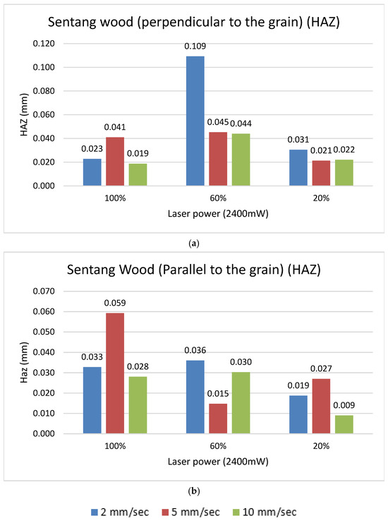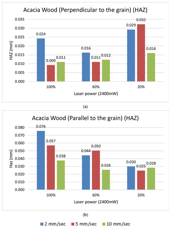 Appendix A), the largest HAZ measured 0.076 mm. Second, the largest HAZ achieved on Acacia wood with grain-parallel direction, 100% laser power, and 5 mm/s speed was 0.057 mm. Thirdly, Acacia wood with a direction parallel to the grain and a laser power of 100% and speed of 5 mm/s. The HAZ was measured at 0.050 mm.