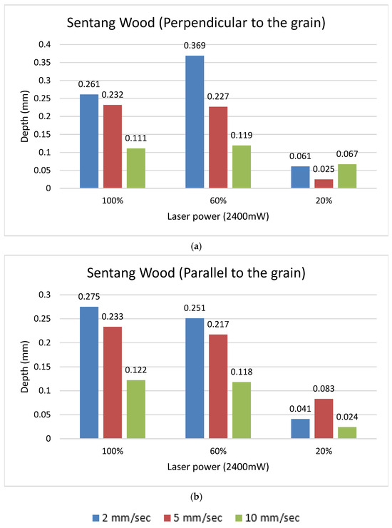 Figure 9 shows the depth of HAZ at laser power and speed on Sentang wood. First, the highest depth of HAZ on Sentang wood was directed perpendicular to the grain with 60% of laser power and 2 mm/s of speed. Therefore, the achieved depth size was 0.369 mm. Secondly, on Sentang wood, the highest depth achieved was 0.275 mm with a grain-parallel direction, 100% laser power, and a 2 mm/s speed. Thirdly, Sentang wood with a direction perpendicular to the grain and a laser power of 100% and a speed of 2 mm/s was measured at 0.2611 mm.