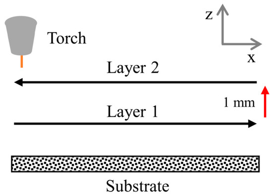 A two-layer wall, with a width equivalent to a single bead and dimensions of approximately 20 × 2 × 3 mm3 (length × width × height), was deposited onto a substrate at room temperature using the processing parameters shown in Table 2. The bidirectional deposition strategy was employed for the fabrication of the wall, as illustrated in Figure 1. The successive overlapped beads were deposited discontinuously, and a 1 mm increment was added to the Z-axis before initiating the deposition of the second bead. No preheating was applied to the substrate. It is important to highlight that two layers are sufficient to carry out the experimental investigations in this work, i.e., the microstructure identification, layer-to-layer bonding analysis, and extraction of the thermal and mechanical behavior of NiTi walls produced by µ-WA-DED using a 0.3 mm NiTi wire. The properties of the finished part are not explored in this work.