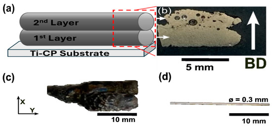 (a) Schematic representation of the layer deposition with emphasis on the region analyzed by SEM, (b) cross-section along the longitudinal direction after metallographic preparation of the sample, (c) panoramic image of the printed NiTi part, and (d) 0.3 mm NiTi wire acquired from Fort Wayne Metals (Fort Wayne, IN, USA). BD: build direction.
