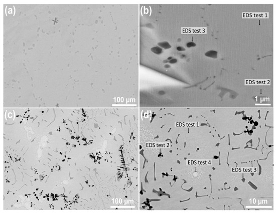 Figure 3 shows the FESEM-BSE images of the microstructure in the 1st and 2nd layers without chemical etching. In the 1st layer (Figure 3a,b), the presence of a small amount of fine Ni-poor phase was observed with mainly globular morphology (darker region) immersed in a Ni-rich matrix (brighter region). In the 2nd layer (Figure 3c,d), at least three phases were observed with different morphology (dendritic, lamellar, and equiaxial) and chemical composition (different shades of gray) in addition to the matrix phase.