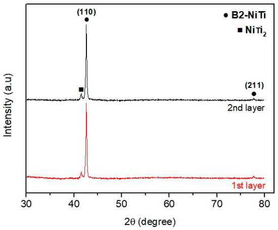 To empirically verify the phases present in the bilayer system, an X-ray diffraction study was carried out. Figure 5 depicts the XRD patterns of the 1st and 2nd layers of the NiTi part obtained by a diffraction plane parallel to its longitudinal ax. The 1st and 2nd layer diffraction peaks attributed to cubic Pm3m structure (ICDD PDF 65-917) were observed, corresponding to the austenite phase (B2-NiTi). Additionally, the primary diffraction peak of a cubic Fd3m structure (ICDD PDF 18-898) was also observed in both layers, indicating the presence of the intermetallic phase (NiTi2). The identification of the B2-NiTi and NiTi2 phases via XRD aligns with the FESEM-BSE analysis. The higher integrated intensity of the diffraction peaks of the B2-NiTi phase suggests the volumetric predominance of this phase in the microstructure of both layers. On the other hand, the low integrated intensity or absence of diffraction peaks associated with the NiTi2 phase, as well as the α-Ti, B19′-NiTi, and Ni3Ti phases, respectively, confirms the observed microstructure in FESEM-BSE images of the 2nd layer that could be due to its lower volumetric fraction.