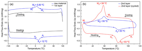 DSC curves of the NiTi part: (a) 1st layer; (b) 2nd layer and 2nd layer (cycled).