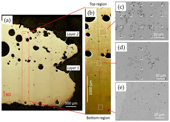 (a) OM image of the cross-section of the printed NiTi part. (b) OM magnified image of the red-rectangle region highlighted in (a), showing the location of nanoindentation imprints. (c–e) FESEM-BSE images of the imprints localized in the two-dimensional array (c) and in the linear array (d,e).