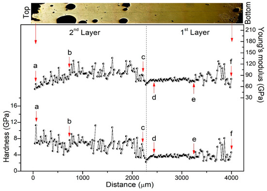 The region between the c and d points in Figure 8 corresponds to the transition between 1st and 2nd layers, resulting in an abrupt change. An in-depth study of this region was conducted by analyzing the E and H values using a smaller spacing between indentations and deeper indentation depths than those used in the linear array test. This study showed that the transition region is narrow, and constrained to around 20 µm, as shown in the E and H profiles of Figure S1 available in the Supplementary Material.