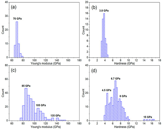 To investigate the mechanical response of single phases in the respective microstructure, bidimensional arrays of indentations were performed into (d–e) and (b–c) regions of the 1st and 2nd layers, respectively. Figure 9 shows the E and H results from histogram plots to clarify the discussion. These results were obtained in both layers. In the 1st layer, a single distribution was observed in both histograms, which can be associated with the B2-NiTi phase, with a peak centered at E = 70 GPa and H = 3.8 GPa (Figure 9a,b, respectively). In the 2nd layer, at least 3 distributions were observed in the E and H histograms (Figure 9c,d, respectively). These distributions were easier to detect in the H histogram (see Figure 9d), as expected, due to the minor stress field volume generated by H in comparison with E [68]. This result indicates that the second layer is multiphasic.