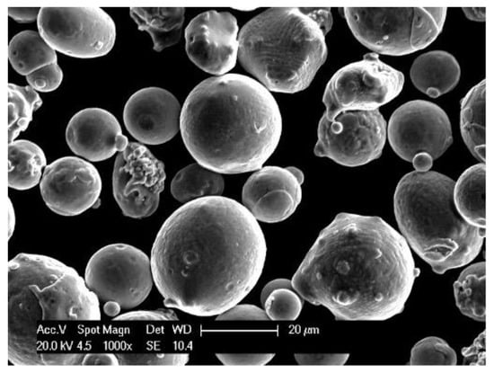 For this study, C45 steel substrates were used, and the cladding material selected was CoCr powder (EOS Gmbh, Munich, Germany) with granule dimensions from 10 to 30 μm. The detailed composition of both the powder and substrate material is detailed in Table 1. The morphology of the employed powder is shown in Figure 1.