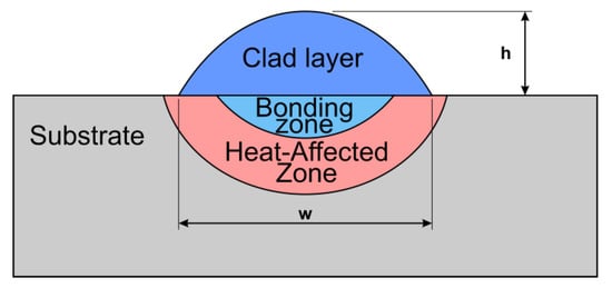 To assess the quality of the single-track clads, in order to use them to produce coatings, the dimensionless parameter width-to-height (wh), or aspect ratio, was calculated using Equation (3) [45]: