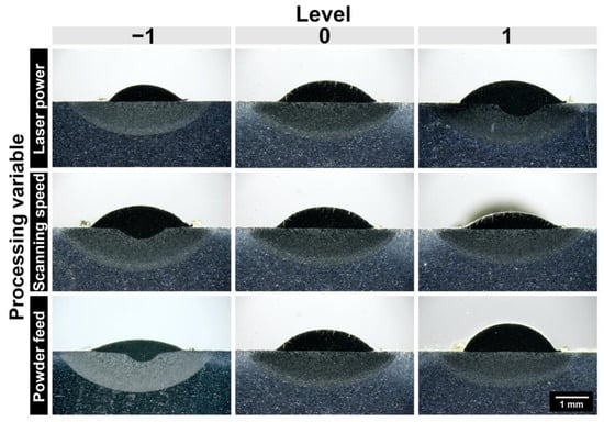 For the successful application of a coating via laser cladding, it is essential to evaluate the geometric characteristics of individual laser-cladded tracks. The cross-sections obtained through optical microscopy (Figure 3) allowed qualitative assessment of how the selected processing variables influence the morphology of the laser-cladded tracks. For example, it can be observed that clad height is positively influenced by laser power and powder feed rate, but negatively influenced by scanning speed.
