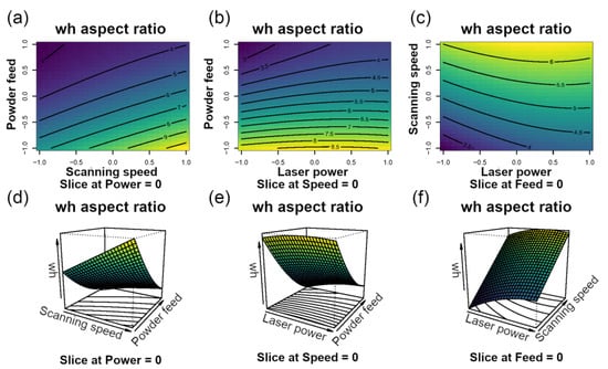 (a–c) 3D Contour graph and (d–f) surface plot of the interaction effect of processing parameters on wh aspect ratio. Slices at laser power = 0 (a,d), scanning speed = 0 (b,e), and powder feed = 0 (c,f).