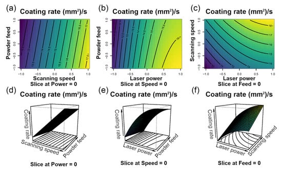 (a–c) 3D contour graph and (d–f) surface plot of the interaction effect of processing parameters on the coating rate response variable. Slices at laser power = 0 (a,d), scanning speed = 0 (b,e), and powder feed = 0 (c,f).