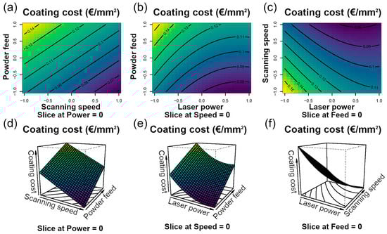 (a–c) 3D contour graph and (d–f) surface plot of the interaction effect of processing parameters on the coating costs response variable. Slices at laser power = 0 (a,d), scanning speed = 0 (b,e), and powder feed = 0 (c,f).