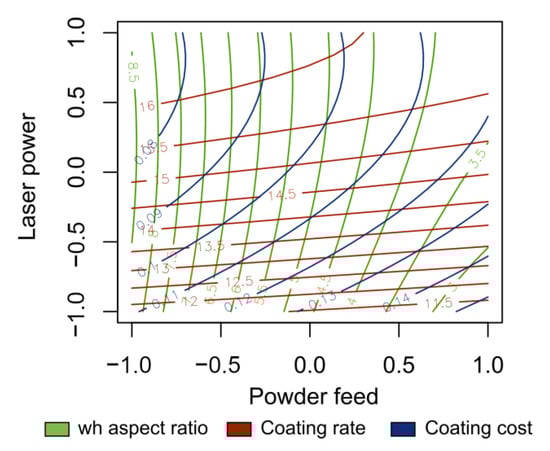Contour curves of each response variable (aspect ratio, coating rate, and coating cost) as a function of the laser power and powder feed rate.