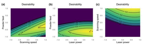 Contour plots of desirability values for laser power = 0 (a), scanning speed = 0 (b), and powder feed = 0 (c).