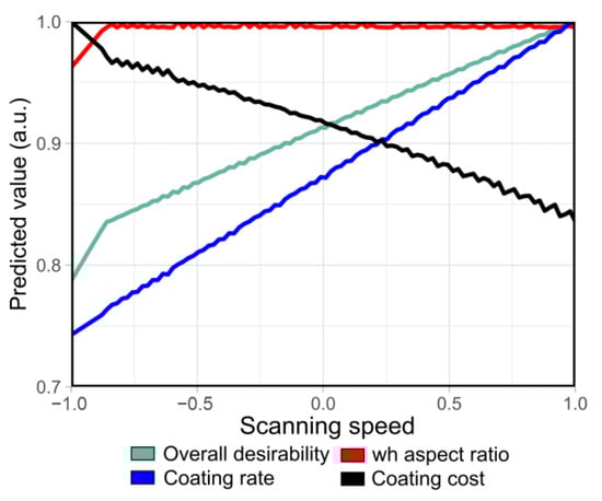 Additionally, while original formula was defined purely as an exponential function (), in this study, each desirability calculation was constructed as a specific function, allowing optimization for maximization, minimization, or searching for a target [57]. Therefore, the wh aspect ratio was targeted at 7, with a minimum of 5 and a maximum of 10. The coating rate was selected as a function to maximize, while the cost was set as a function to minimize. Performing these calculations, the overall function of desirability was achieved. This function varies with the defined processing parameters, and its values are shown in Figure 8.