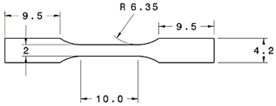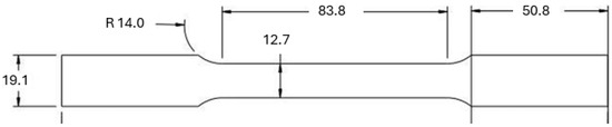 Sheet specimen geometry used for uniaxial tension testing according to ASTM E8 guidelines (dimensions are in mm).