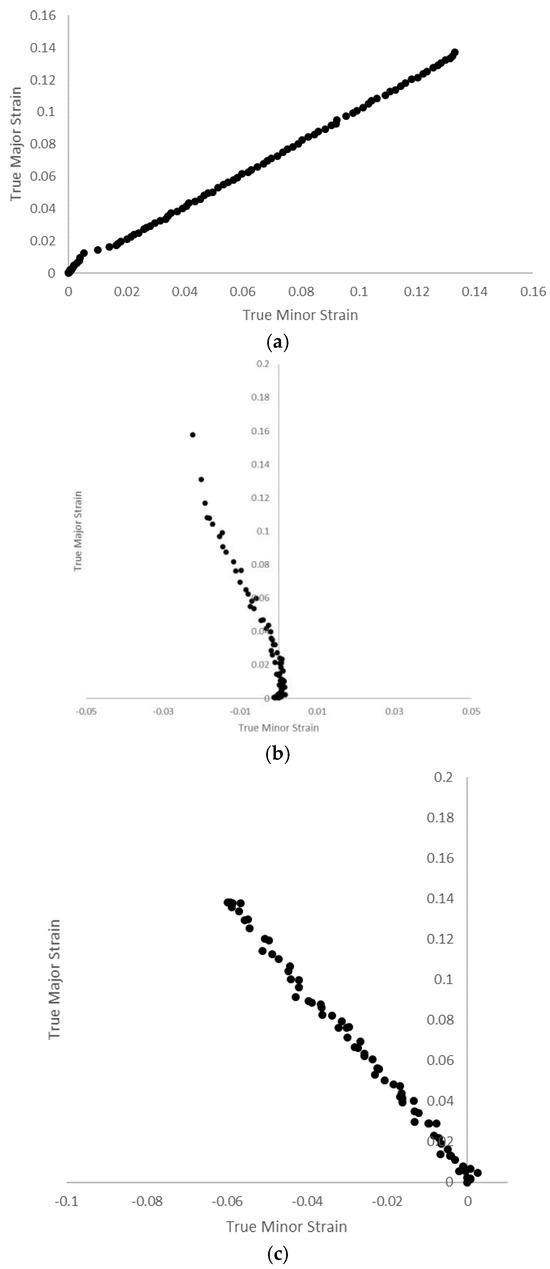 DIC-measured strain paths for TBF 1180 specimens under biaxial tension (a), plane-strain tension (b), and uniaxial tension (c).