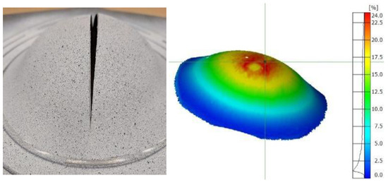 Biaxial tension specimen after failure (left) and corresponding strain map just before failure (right).