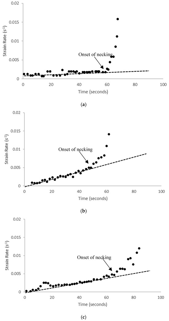 Onset of necking identified by divergence of strain rate at eventual fracture location for (a) biaxial tension, (b) plane-strain tension, and (c) uniaxial tension.