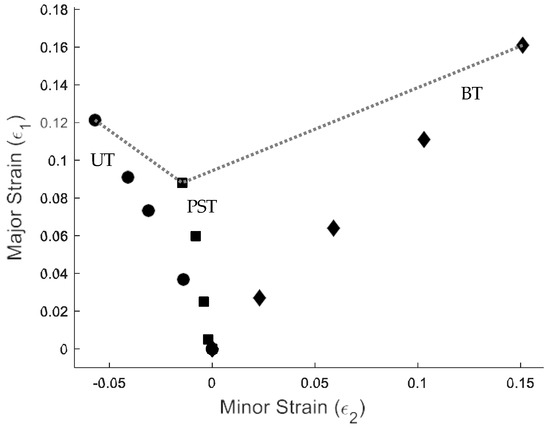 Forming limit diagram for TBF 1180 steel. Strain paths: circles (uniaxial tension—UT); squares (plane-strain tension—PST); diamonds (biaxial tension—BT).