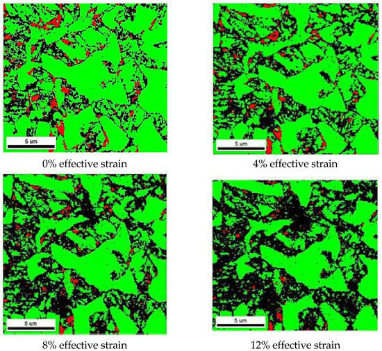 In terms of the transformation of RA grains in the TBF 1180, EBSD was used to measure the RA content as a function of the plastic strain. Most of the tests were incremental ex situ measurements of the RA, but one in situ uniaxial test provided confirmation that the ex situ scans were statistically sound, in terms of being able to compare different scans at various strain levels. The phase maps for the in situ uniaxial tension specimen are shown in Figure 8, where the initial RA content (at 0% true strain) was 6.4%, transforming progressively to 1.3% when the specimen fractured (at 12% true strain). As previously described, similar maps were produced at interrupted strain levels for each of the ex situ deformation strain paths.