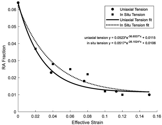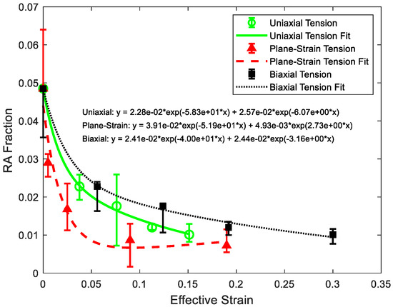 Percent RA as a function of effective strain for the three strain paths (fit equations are shown for each case, where a two-term exponential was used).