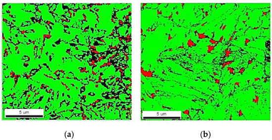 Typical unstrained microstructures of (a) TBF 1180 steel (6.7% RA) and (b) Q&P steel (8.7% RA) [14]. BCC and BCT phases are green (ferrite, bainite, and martensite) and FCC phases are red (RA).