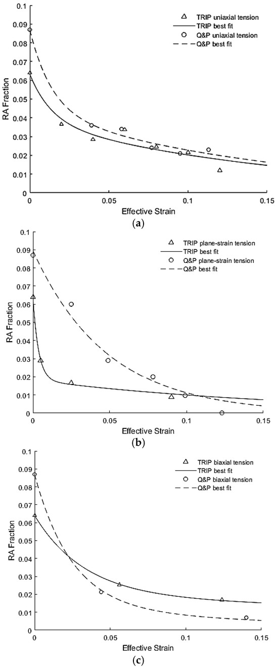 RA transformation as a function of effective strain for TBF 1180 and Q&P 1180 steel under (a) uniaxial tension, (b) plane-strain tension, and (c) biaxial tension.