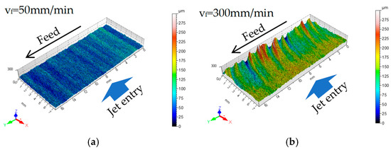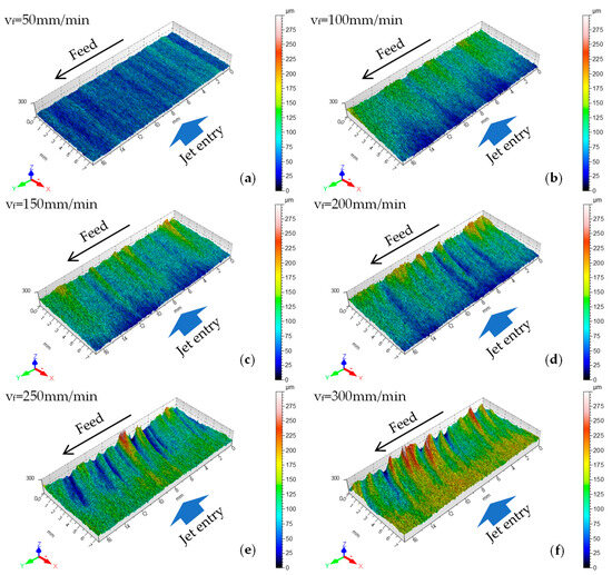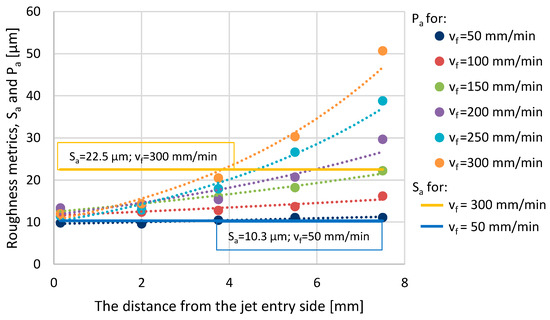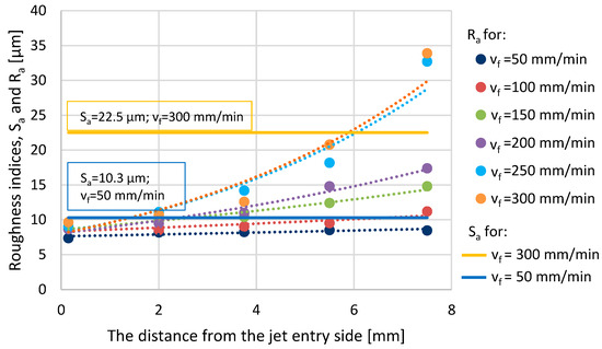 - As the feed speed increases, we also experience an increase in the roughness parameters, which is not typical near the entry side; here, the roughness hardly changes because the jet has sufficiently high energy, which is sufficient for adequate material removal even at low feed speeds;