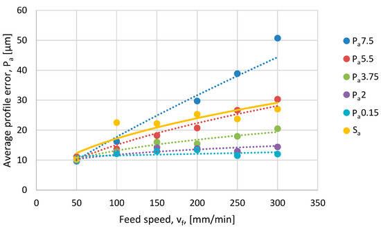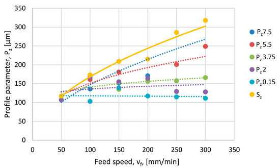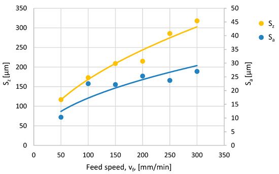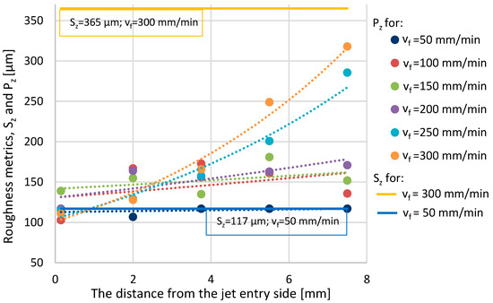 - The Pa, Pz, Sa, and Sz values basically increase as a function of the distance from the entry side. At low feed speeds, this increase is not significant, but can be strongly observed when using higher feed speeds;
