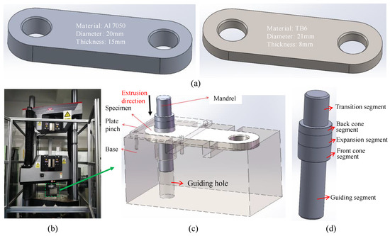 Experimental setup: (a) specimen; (b) hydraulic machine; (c) fixture; (d) mandrel.