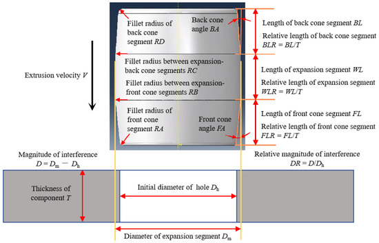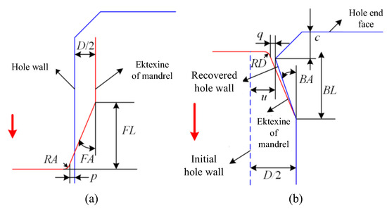 Among the 11 independent parameters of the DMCE process, D and V are universally acknowledged to have a significant influence on the fatigue enhancement effect, while the other nine mandrel structural parameters are less studied. The magnitude of interference D directly influences the deformation degree and in turn, influences the induced residual stress and final fatigue performance [35,36]. The extrusion speed V influences the strain rate and in turn, influences the deformation uniformity and induced residual stress [37]. Therefore, single-factor simulations with nine mandrel structural parameters were carried out to screen out the significant mandrel structural parameters, and the simulation scheme is listed in Table 7. A parameter can be judged to be non-significant if any one of the following conditions is met: (a) the independent influence of a parameter on residual stress and plastic deformation is negligible; (b) the independent influence of a parameter can be completely eliminated by optimizing other parameters. The influence degrees of the mandrel structural parameters on the mean tangential residual stress and the mean radial plastic deformation of the hole walls after the DMCE process were compared, as shown in Figure 5 (taking Al7050 alloy as an example). As can be seen in this figure, in comparison to FA, BA and WLR, the influence of the other six mandrel structural parameters on the surface integrity of the hole wall is small. The influences of RA, RB, RC and RD are almost negligible. The influence of FL/FLR is derived from the thrusting effect of the front cone segment fillet corner on the hole wall, which causes surface scratch and can be avoided by facilitating a positive distance p between the front cone segment fillet corner to the hole wall, as shown in Figure 6a and Equation (1). Similarly, in order to avoid the adverse effect of the back cone segment fillet corner on the hole wall, the distance q between the fillet corner to the hole wall should always be positive, as shown in Figure 6b and Equation (2).