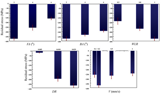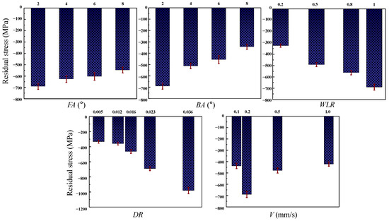 The influence of the significant DMCE parameters on the mean tangential residual stress of Al and Ti hole walls after expansion are shown in Figure 7 and Figure 8, respectively. As shown in Figure 7, the mean tangential residual stresses of the hole wall are compressive after the expansion due to the compression effect of the mandrel. With an increase in the front cone angle FA, the compressive residual stress continuously decreases. This is because the increase in FA accelerates the deformation process of the hole wall, resulting in inadequate dislocation accumulation and, therefore, smaller compressive residual stress [21,30]. With an increase in the back cone angle BA, the compressive residual stress continuously decreases. This is because an increase in BA promotes the material recovery and stress release of the hole wall after expansion. With an increase in the expansion segment length WL/WLR, the compressive residual stress continuously increases. This is because the increase in WL/WLR extends the retention time of the material deformation and then increases the dislocation density. Moreover, with the increase in interference magnitude, the compressive residual stress continuously increases. This is because the increase in WL/WLR promotes the deformation degree and dislocation density. However, there is no obvious positive or negative correlation relationship between the extrusion speed and residual stress. With the increase in extrusion velocity V, the compressive residual stress first increases and then decreases. As shown in Figure 8, the influence mechanism of the DMCE parameters on the TB6 hole are the same as that of the Al7050 alloy.