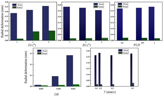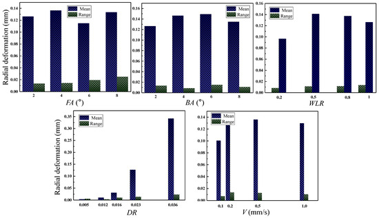 In order to directly evaluate the influence of the DMCE process parameters on the radial deformation field of the hole wall, this work focuses on the absolute value of the plastic deformations. The influences of the significant DMCE parameters on the mean and range of the radial plastic deformations of Al and Ti hole walls after expansion are shown in Figure 9 and Figure 10, respectively. As shown in Figure 9, with the increase in FA, the mean radial plastic deformation increases and the range of deformations extends. This is because the larger front cone angle improves the deformation rate, which increases the mean deformation due to the inertial effect of material flow and reduces the deformation uniformity. The increased radial deformation leads to a thicker plastic strengthening layer, which brings more obstacles to crack propagation and, therefore, improves the fatigue resistance of holes-involved specimens. With the increase in BA, the mean of plastic deformations decreases but its range increases. This is because the larger back cone angle speeds up the material recovery, which increases the material recovery degree, decreases the mean plastic deformation, and reduces the deformation uniformity. With the increase in WL/WLR, the mean of plastic deformation increases but its range decreases. This is because the longer expansion segment extends the retention time of overall deformation, which promotes dislocation accumulation and deformation uniformity, resulting in a greater mean and a smaller range of plastic deformations. With the increase in D/DR, both the mean and range of plastic deformations increase. This is because the larger interference magnitude directly improves the overall deformation and plastic deformation, which brings out more deformation uniformity. Moreover, the mean radial plastic deformation seems irrelevant to the extrusion velocity while the range of plastic deformations is positively correlated with extrusion velocity. This is because the higher velocity leads to more deformation uniformity. As compared to the Al alloy, except for the interference magnitude, other parameters show a very small influence on the mean and range of radial plastic deformations of the hole made by TB6, which originates from the higher strength and hardness of the Ti alloy, therefore, it appears as a weaker inertial effect in the material deformation.